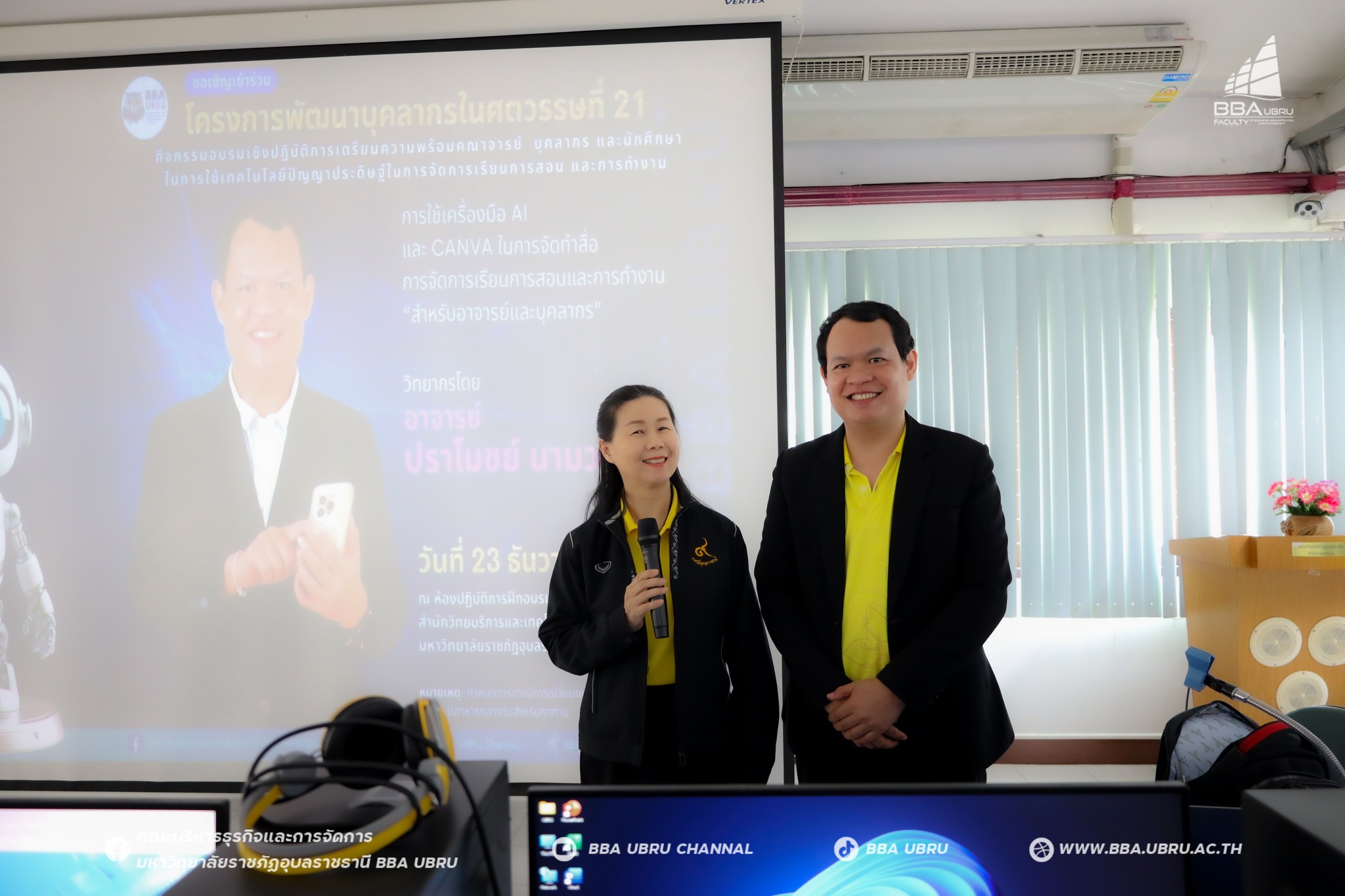 จัดโครงการเพิ่มประสิทธิภาพการบริหารจัดการคณะ กิจกรรมอบรมเชิงปฏิบัติการเตรียมความพร้อมคณาจารย์ และบุคลากรในการใช้เทคโนโลยีปัญญาประดิษฐ์ในการจัดการเรียนการสอน และการทำงาน ซึ่งมีวัตถุประสงค์เพื่อพัฒนาความรู้และทักษะด้านปัญญาประดิษฐ์ (AI) ให้กับคณาจารย์ และบุคลากรของคณะบริหารธุรกิจและการจัดการ เพื่อส่งเสริมการประยุกต์ใช้เทคโนโลยี AI ในการปฏิบัติงาน การจัดการเรียนการสอน การวิจัย การบริการวิชาการ พิ่มศักยภาพในการวิเคราะห์ข้อมูลและการประมวลผลเชิงลึก โดยใช้ AI ในการสนับสนุนการตัดสินใจและแก้ไขปัญหาให้มีประสิทธิภาพ เพื่อพัฒนาโมเดลการเรียนการสอนที่ผสานการใช้ AI เข้ากับหลักสูตรที่สอดคล้องกับอุตสาหกรรมในปัจจุบันและอนาคต และเพื่อเสริมสร้างความสัมพันธ์ระหว่างคนในองค์กร สามารถทำงานร่วมกันได้อย่างมีประสิทธิภาพ ฝึกทักษะที่จำเป็นต่อการทำงานร่วมกัน ทักษะการสื่อสาร ทักษะการเจรจาต่อรอง ลดปัญหาความขัดแย้ง (Resolve Conflict) สร้างพื้นที่ปลอดภัย แก้ปัญหา หรือหาทางออก (Resolution) ร่วมกัน ณ ห้องปฏิบัติการฝึกอบรมคอมพิวเตอร์ ชั้น ๒ สำนักวิทยบริการและเทคโนโลยีสารสนเทศ มหาวิทยาลัยราชภัฏอุบลราชธานี