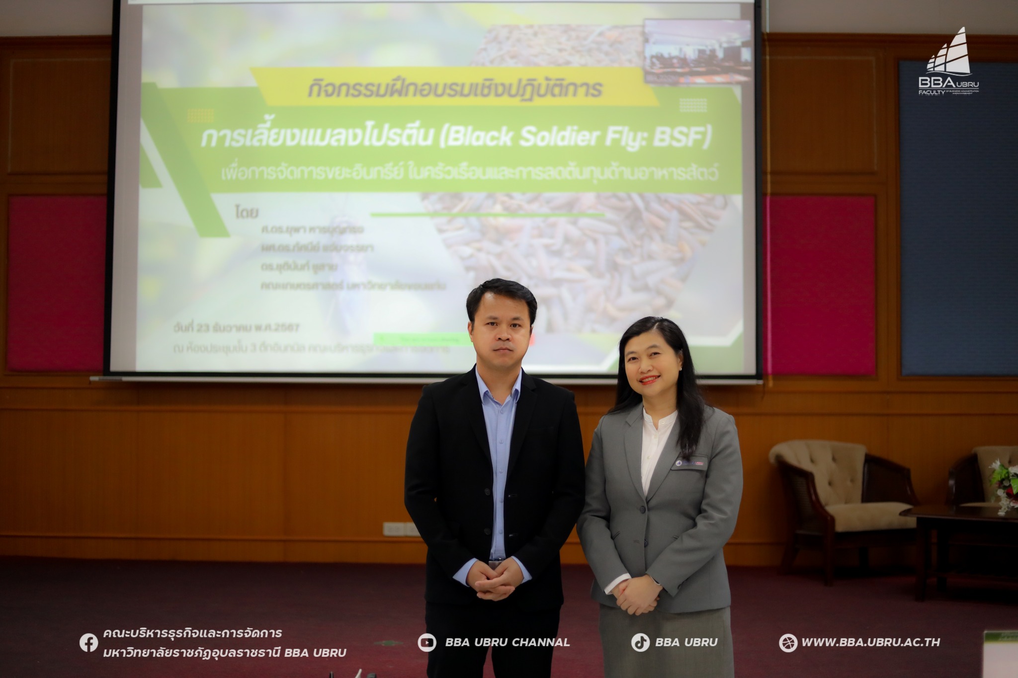 วันที่ 24 ธ.ค. 67 รศ.ดร.ประนอม คำผา คณบดีคณะบริหารธุรกิจและการจัดการ มอบหมาย ผศ.ดร.ฐิติพร อุ่นใจ รองคณบดีฝ่ายวิชาการ ประธานเปิดกิจกรรมฝึกอบรมเชิงปฏิบัติการ การเลี้ยงแมลงโปรตีน (Black Soldier Fly: BSF) เพื่อการจัดการขยะอินทรีย์ในครัวเรือนและการลดต้นทุนด้านอาหารสัตว์ และการประชุมชี้แจงกรอบวิจัยและชี้แจงแนวทางการดำเนินงาน โครงการ "การจัดการขยะอาหารอย่างครบวงจรในเขตเทศบาลนครอุบลราชธานีบนฐานเศรษฐกิจสีเขียว" โดย ศ.ดร.ยุพา หาญบุญทรง จากคณะเกษตรศาสตร์ มหาวิทยาลัยขอนแก่น, ผศ.พัฒนศักดิ์ ปทุมวัน จากคณะบริหารธุรกิจและการจัดการ มหาวิทยาลัยราชภัฏอุบลราชธานี, ดร.กุลวรรณ โสรัจจ์ คณะวิทยาศาสตรี มหาวิทยาลัยราชภัฏอุบลราชธานี, ผศ.ดร.ทัศนีย์ แจ่มจรรยา จากคณะเกษตรศาสตร์ มหาวิทยาลัยขอนแก่น, ดร.ชุตินันท์ ชูสาย จากมหาวิทยาลัยขอนแก่น คณะเกษตรศาสตร์, น.ส.ทฤตมน ทองเรือง นักวิชาการสาธารณสุขชำนาญการ และ น.ส.มนต์ปรินทร ทิพย์ธนาวิวัฒ Young Smart Farmer ณ ห้องประชุม ชั้น 3 ตึกอินทนิล คณะบริหารธุรกิจและการจัดการมหาวิทยาลัยราชภัฎอุบลราชธานี