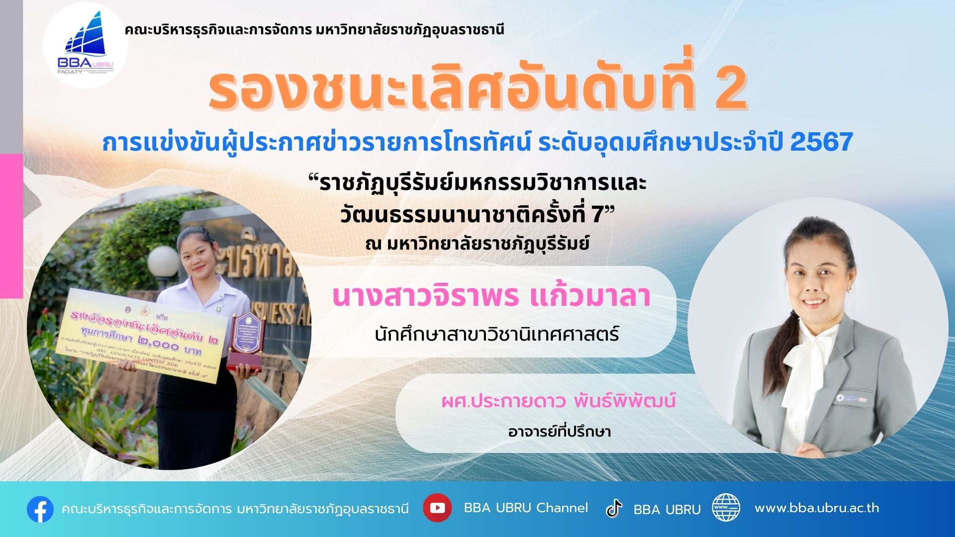 รองชนะเลิศอันดับที่ 2 การแข่งขันผู้ประกาศข่าวรายการโทรทัศน์ ระดับอุดมศึกษาประจำปี 2567 ?ราชภัฏบุรีรัมย์มหกรรมวิชาการและวัฒนธรรมนานาชาติครั้งที่ 7?